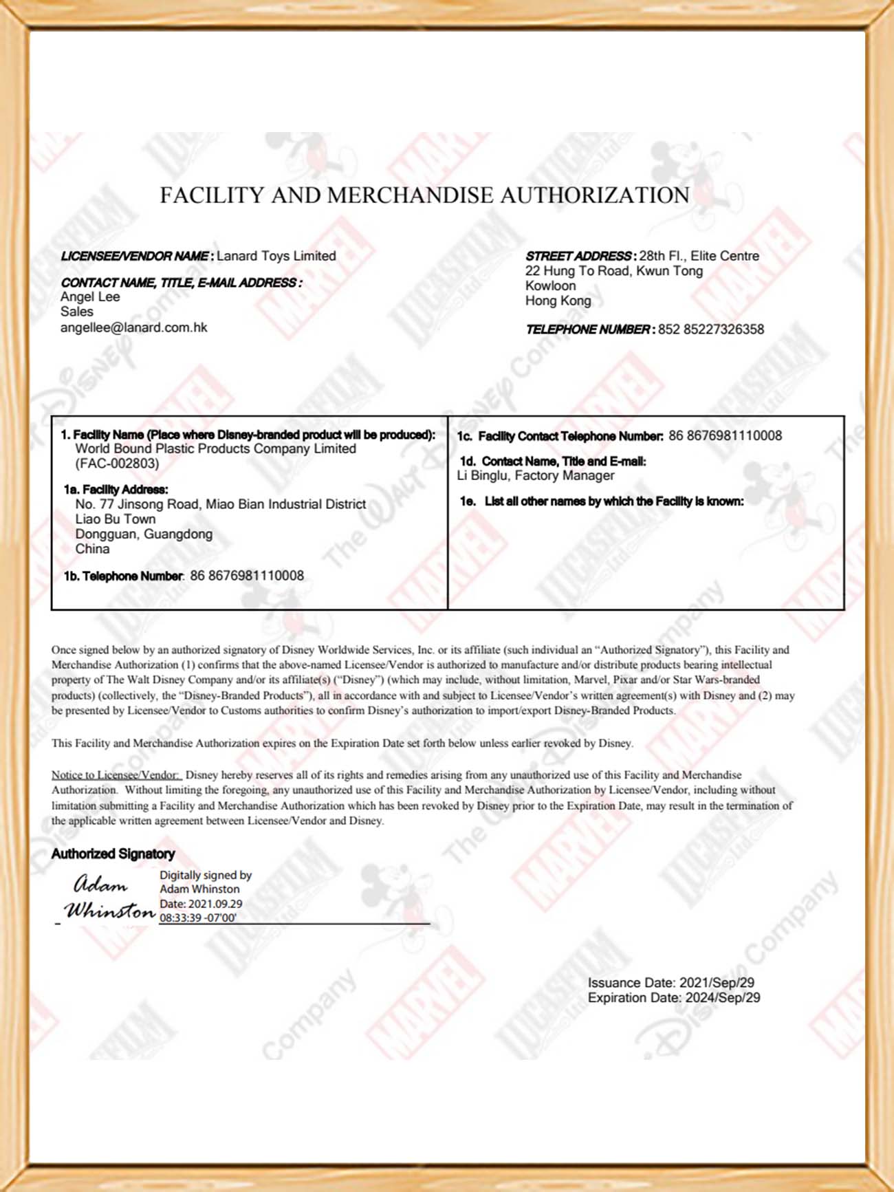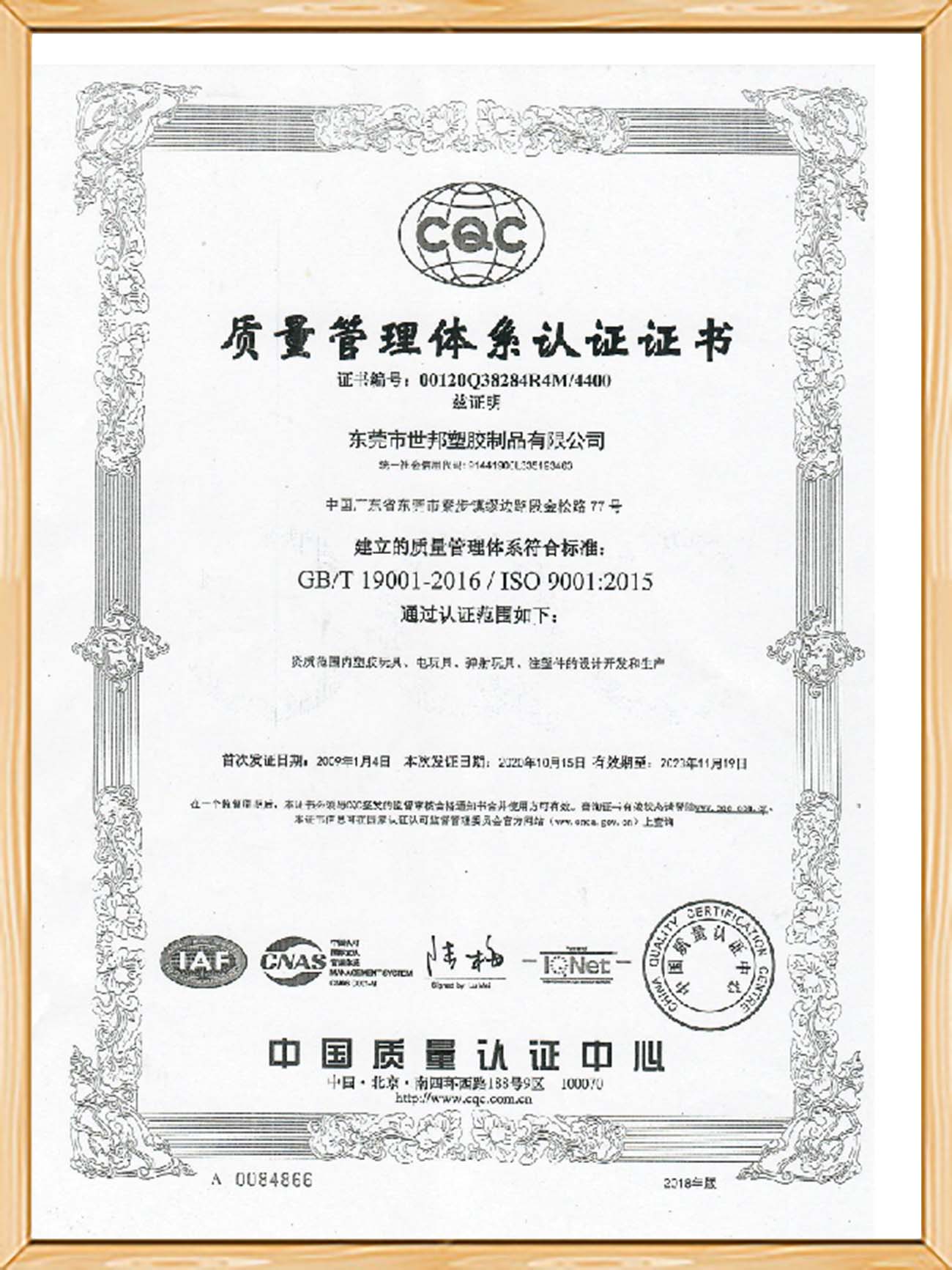 東莞市世邦塑膠制品有限公司玩具事業部隸屬于世邦集團,廠房面積27000平方米,我們有BSCI和SEDEX驗廠報告,NBCU環球認證,并通過WALMART, TARGET, HOMEDEPOT, DISNEY等大型美國商超認證,已取得IETP、3C、GSV、ISO9001、SCAN、ICTI、SMETA等多種合格證書。主要產品有模具、玩具、電器配件、醫療器械配件、家電類配件、電子產品、小家電、寵物用品,為高端品牌提供從產品設計、精密模具制造、注塑成型與組裝、售后服務為一體整套解決方案。有迪士尼授權認證,目前為多個國家和海內外知名企業提供禮品定制服務、代工生產服務、并成為長期的合作伙伴,(如:日本萬代、迪士尼、epoch等品牌合作) 世邦集團成立于2002年,以智能制造,精密制造為核心,運用合作共建,共享,共贏的模式,整合制造上下游供應鏈,優化全產業鏈,成為設計與創新,服務與生產為一體的智能智造企業集團。 世邦集團旗下設有8家制造工廠,遍布于東莞、廣州、深圳和越南;2家研發中心,分布于上海和香港。擁有精密模具制造車間、無塵注塑生產車間、無塵表面處理車間。擁有CNC、鏡面火花車間、各類大中型注塑生產線及壓鑄、精密吹塑生產線、環保真空飛鋁鍍膜生產線、全自動噴油生產線、邦定、SMT貼片、智能COB固晶生產線等數百臺先進制造設備。
